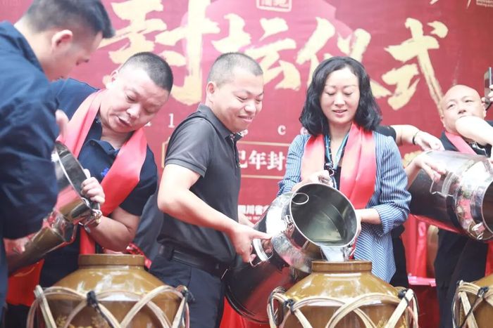 在分会场成都大地魂酒业有限公司厂区内,“封坛祈愿”存酒盛典的现场热闹非凡,吸引着众多市民驻足。古朴的民乐演奏如潺潺流水,百余名游客与嘉宾齐聚于此,共同见证这一充满文化底蕴的时刻。非遗代表性传承人王子越先生登台,讲述封坛酒的文化渊源与技艺精髓,让大家对这一传统技艺有了更深的了解。
